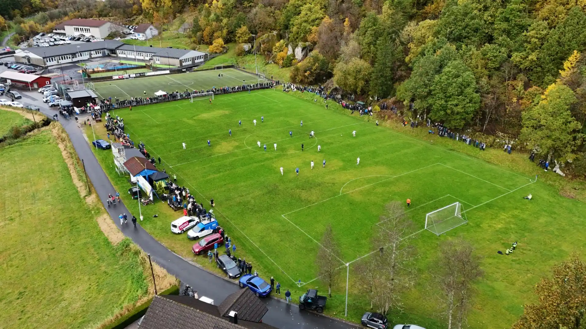 Dronefoto av Helleland ILs historiske semfinalekamp i Rogalandscupen mot Varhaug i 2024.